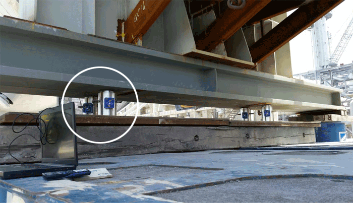 在實(shí)際測(cè)重的過程中,4臺(tái)無線壓力傳感單元被分別固定在運(yùn)送蒸餾塔的自行式模塊運(yùn)輸車的甲板和支撐蒸餾塔的結(jié)構(gòu)梁之間這塊空間內(nèi)的4個(gè)端角處,以準(zhǔn)確確定此蒸餾塔的總重信息。
