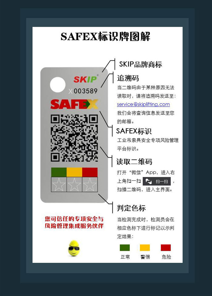 《一般用途鋼絲繩吊索特性和技術(shù)條件》(GB/T 16762-2009 )7.1.3條規(guī)定:包裝前每件吊索都應(yīng)掛有標(biāo)簽,標(biāo)牌上應(yīng)注有吊索的執(zhí)行標(biāo)準(zhǔn)、直徑長度、額定工作載荷和產(chǎn)品編號。今天就帶你了解一下不一樣的SafeX索具標(biāo)牌。