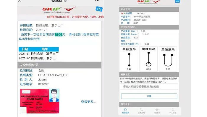 上圖為SAFEX系統(tǒng)主界面,我們看到他主要顯示了索具的評估結(jié)果、精確的過往檢驗日期和下次檢驗日期、索具的檢驗人及資質(zhì)、索具的基本信息、安全技術(shù)指標(biāo)和一套非常實用的載荷計算小工具。這套系統(tǒng)界面中的信息能幫助使用者更好的了解產(chǎn)品的安全性能,在索具檢測時也能更完整清晰的記錄檢測信息,SAFEX為您的安全管理細節(jié)賦能!