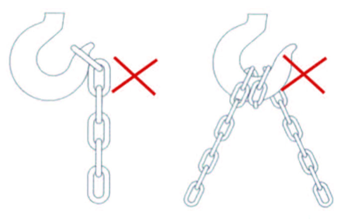 鏈條索具的安全使用 ▶ 起重吊裝操作前,您不僅要完全理解和明白如何使用相關(guān)產(chǎn)品與設(shè)備,并且還要掌握正確的結(jié)索方法和結(jié)索模式系數(shù)。▶ 不得使用質(zhì)量有缺陷的鏈條索具或連接輔件。▶ 不得利用外力敲擊或拉拽鏈條索具或其連接輔件以固定安裝到位,必須通過(guò)正確方法進(jìn)行結(jié)索。查看整個(gè)索具上各連接部位包括與負(fù)荷物連接的部位是否已固定好。▶ 吊鉤與負(fù)荷物連接時(shí),其開(kāi)口必須朝外。鉤尖或其他不應(yīng)成為主要受力區(qū)域的部位承重。▶ 保證鏈條上沒(méi)有任何打彎或打結(jié)現(xiàn)象。▶ 不用的肢鏈必須掛到主環(huán)上,避免因其纏繞而導(dǎo)致意外情況發(fā)生。▶ 緩慢穩(wěn)步移動(dòng)負(fù)荷物,避免產(chǎn)生沖擊載荷。▶ 在空中懸吊的負(fù)荷物必須有人照看。出現(xiàn)緊急狀況,需布置警戒線。 ▶ 此維護(hù)要求是基于一般用途而設(shè)定的最低標(biāo)準(zhǔn)。▶ 保持鏈條索具表面清潔且沒(méi)有任何銹蝕,定期檢查是否存在缺陷問(wèn)題。▶ 遇到以下特殊情況,請(qǐng)向?qū)I(yè)人士咨詢:產(chǎn)品標(biāo)識(shí)模糊不清;連接輔件變形、磨損或過(guò)度拉伸;鏈環(huán)彎曲或扭曲;安全防護(hù)裝置失效;鏈條及其連接輔件出現(xiàn)割傷、缺口、鑿孔、裂痕、腐蝕,高溫狀態(tài)下的退色現(xiàn)象或其他任何明顯缺陷問(wèn)題。▶ 其它詳盡信息請(qǐng)參照英國(guó)吊裝工程師協(xié)會(huì)出版的吊裝設(shè)備安全使用規(guī)范(COPSULE)。