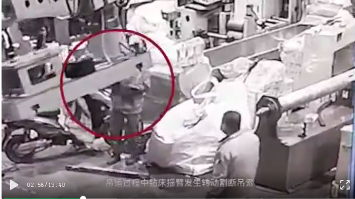 圖片事故案例發(fā)生于2020年,吊運過程中鉆床搖臂發(fā)生轉(zhuǎn)動割斷吊索,致使紅圈中錢某當(dāng)場被砸死。