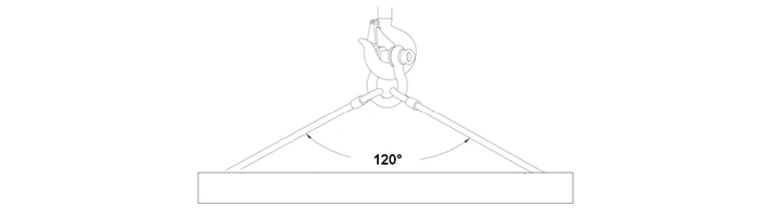 — 卸扣作為主環(huán)使用時(shí),左右兩條分肢必須呈對(duì)稱分布,而且兩條分肢之間的夾角最大不得超過(guò)120°。